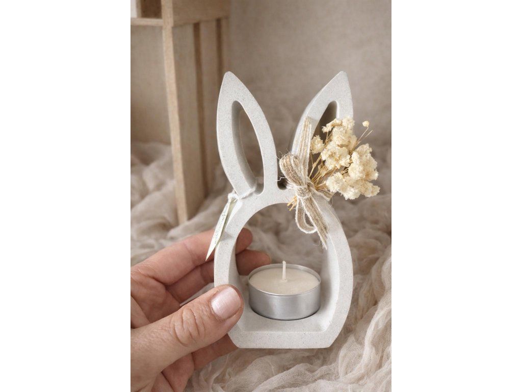 Designová dekorace (svícen) vyrobena z přírodního minerálního kompozitu (jesmonite v odstínu přírodního kamene) – materiálu, který spojuje pevnost, jemnost a čistý vzhled.